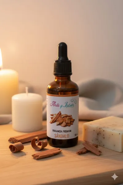 Nuestra fragancia premium Sándalo tiene un aroma cálido, amaderado y elegante que transmite relajación y sofisticación. Ideal para dar un toque profundo y profesional a tus productos artesanales.